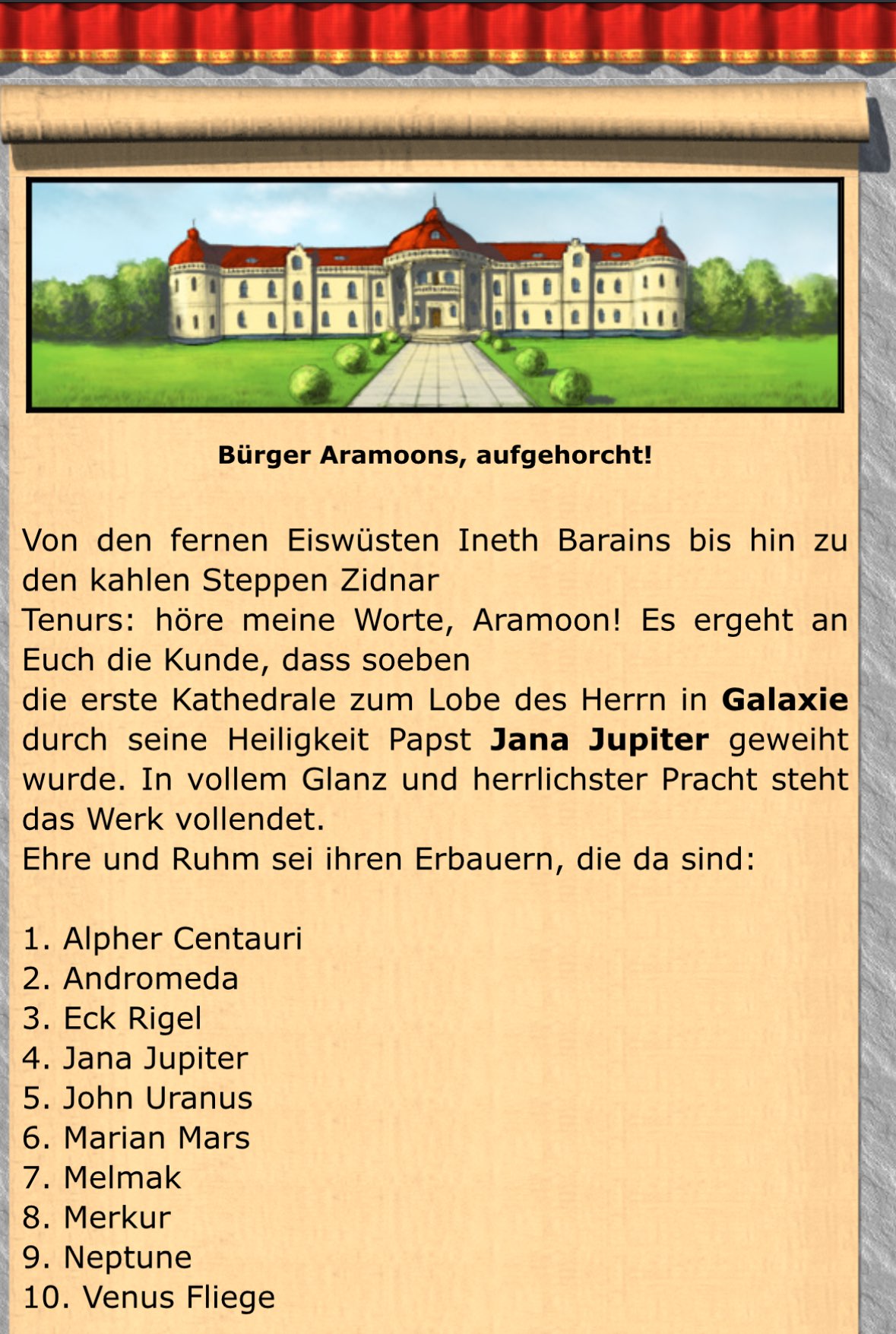 Am 20.12.2023 wurde, 90 Tage nach der Ankunft, die erste Kathedrale in Galaxie durch ihre Heiligkeit Päpstin Jana Jupiter geweiht. Damit hat Susi Saturn mit der Allianz Himmelskoerper den Sieg errungen.