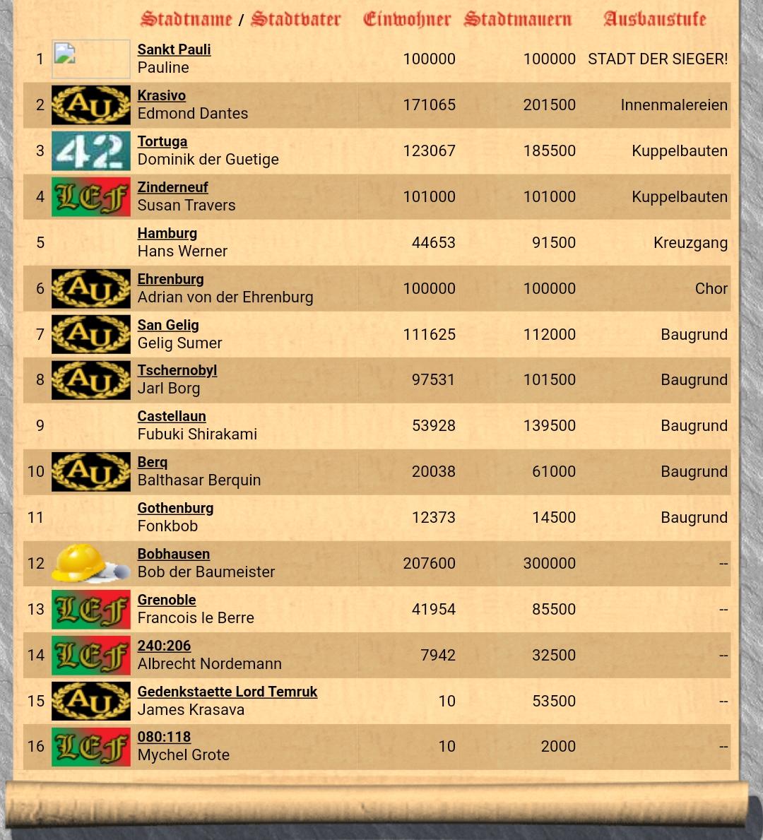 Umso beeindruckender sind die Leistungen zu bewerten, welche unsere Städtebauer erreicht hatten. Bis zum Schluss war es ein Kopf an Kopf Rennen von zwei Städten. Auf der einen Seite die Allianz der Areither Union, mit Edmond Dantes, der im Besitz der stolzen Stadt Krasivo war und auf der anderen Seite Pauline von der Allianz Weiberwirtschaft mit Sankt Pauli. In Letzterer wurde auch die Kathedrale, von dem kurz zuvor gewählten Papst Raziel Zasalamel, geweiht.